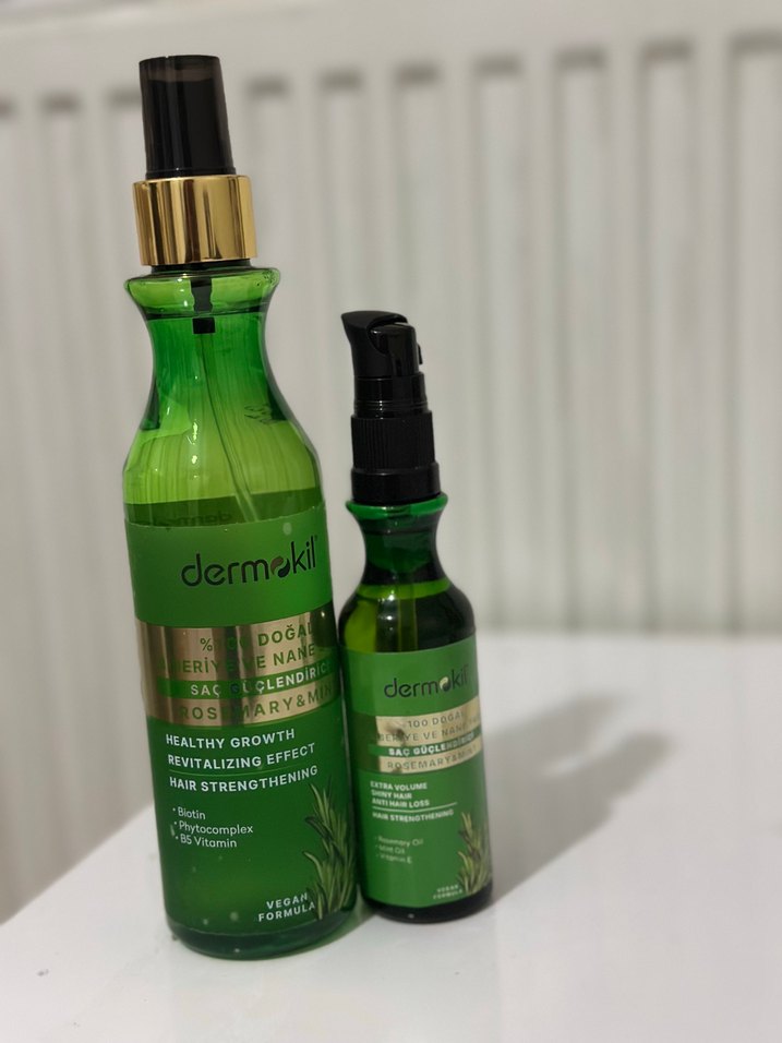 Dermokil doğal içerikli saç serumu ve bakım maskesi, biotin ve biberiye ile saçları güçlendirir ve canlandırır. Vegan formül.