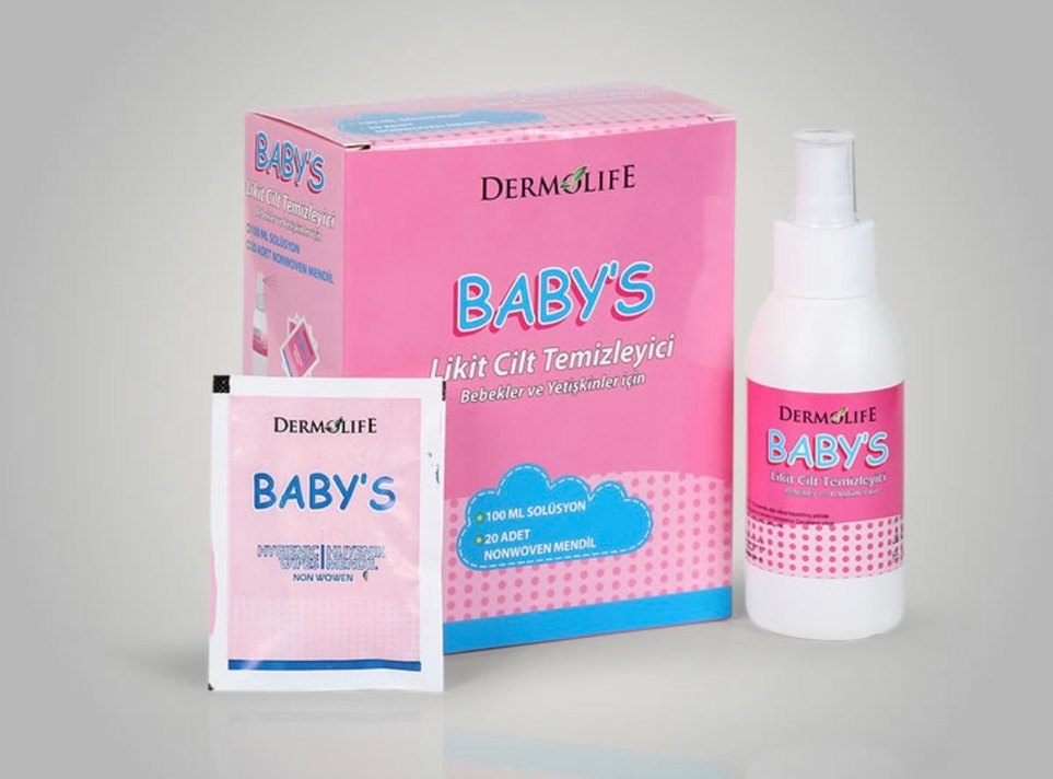 DERMOLIFE BABY'S, bebekler ve yetişkinler için uygun likit cilt temizleyici. 100 ml solüsyon ve 20 adet nonwoven mendil içerir.
