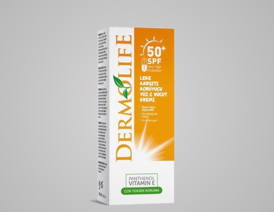 Dermolife yüz ve vücut kremi, SPF 50+ ile çok yüksek koruma sağlar. Panthenol ve E vitamini içerir, lekelere karşı korur ve cildi destekler.