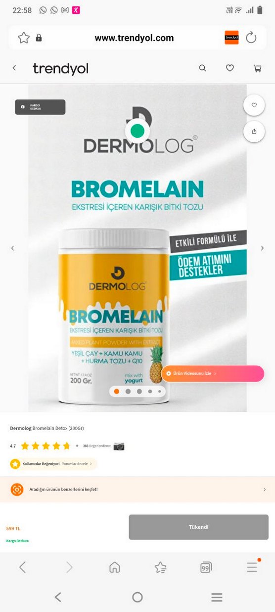Dermolog Bromelain Detox, ödem atımını destekleyen yeşil çay, kamukamu, hurma tozu ve Q10 içeren karışık bitki tozudur. Yoğurtla karıştırılarak kullanılır.