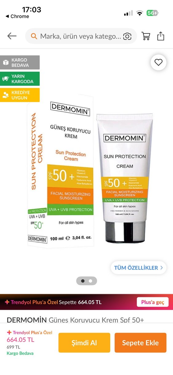 Dermomin SPF 50+ güneş koruyucu krem, yüz için nemlendirici etkili ve UVA+UVB koruması sağlar. Tüm cilt tiplerine uygundur. Vitamin E ve hyaluronik asit içerir. ☀️ Hiç kullanılmamıştır