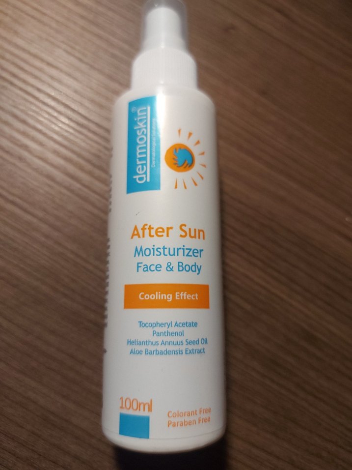 Dermoskin After Sun yüz ve vücut nemlendirici, ferahlatıcı etki sağlar. Pantenol, tokoferil asetat, ayçiçeği tohumu yağı ve aloe özü içerir. Paraben ve renklendirici içermez. Güneş sonrası ferahlatma sağlayan nemlendirici sprey kremdir. Aslında yaz için uygundur çünkü güneşin verdiği yangı ve ateş hissini azaltarak soğutma ve ferahlık hissi verir. Fakat yaşa bağlı ateş basması vs oluyorsa, vücudunuza ya da kol ve bacaklariniza kullanabilirsiniz ♀️ Sadece bir iki kez kullandım ağustos sonu gibi, dopdolu. Dermoskin orijinal markasıdır. 100 mldir.