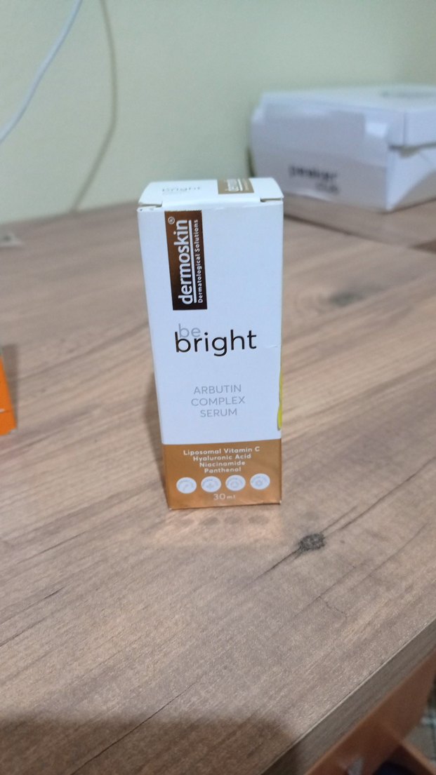 Dermoskin Be Bright serumu, arbutin kompleksi, C vitamini, hyaluronik asit, niasinamid ve panthenol içerir, cilt parlaklığını ve yaşlanma karşıtı etkisini destekler. kullanıldı ama iyi durumda