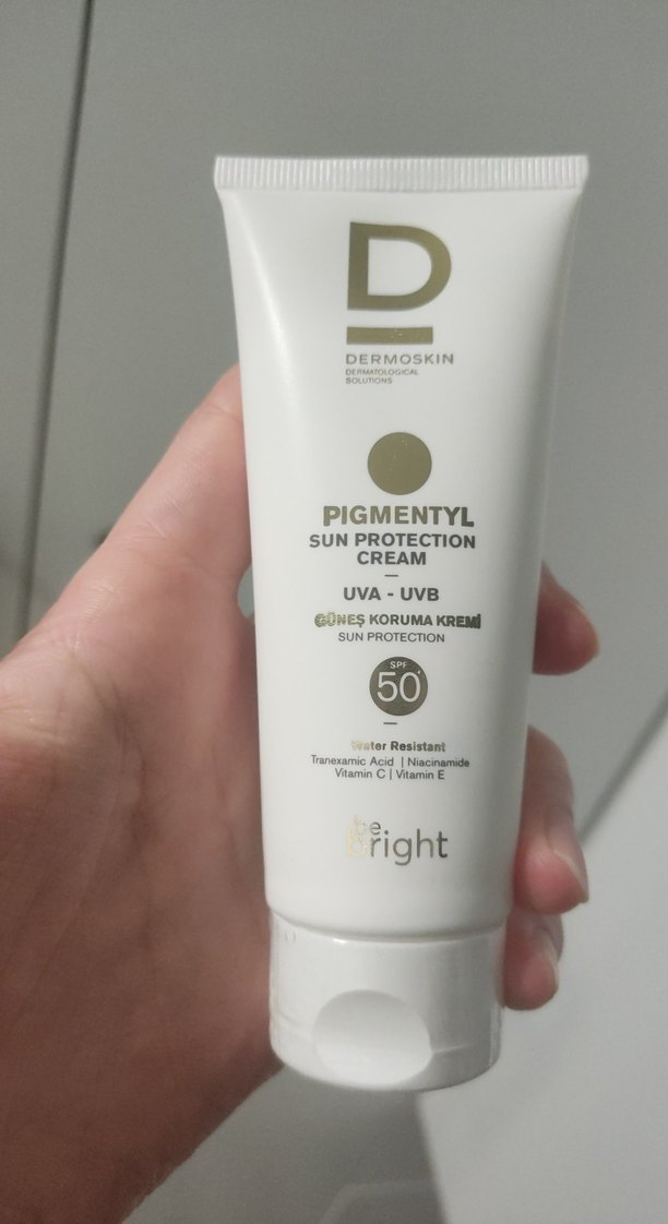 D Pigmentyl güneş koruyucu krem, SPF 50 ile geniş UVA-UVB koruması sağlar. Suya dayanıklıdır ve Traneksamik Asit, Niasinamid, C ve E vitamini içerir. eczane ürünü götürüp eczaneden test edebilirsiniz hiç açılmadı.