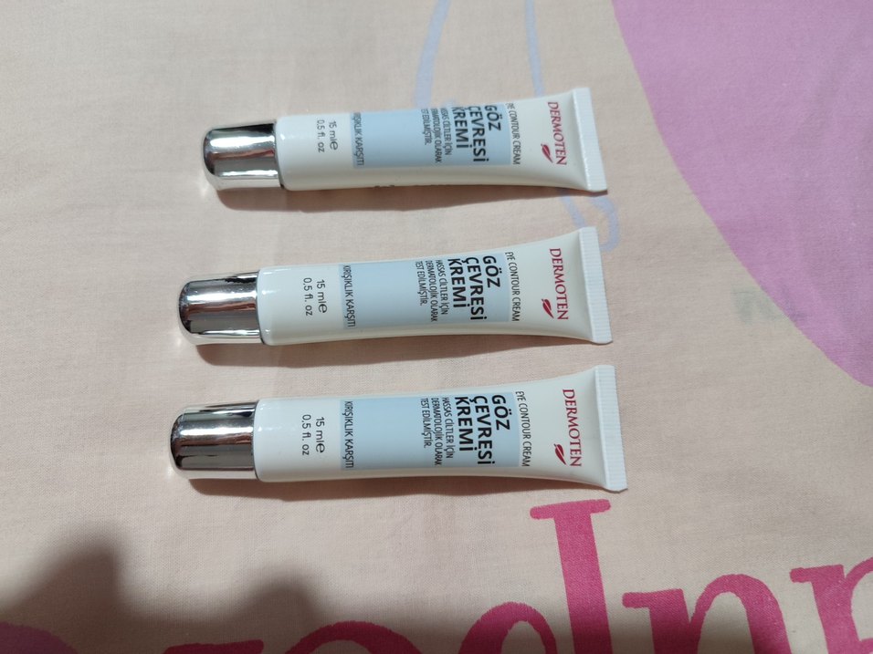 Dermoten göz çevresi kremi, 15 ml beyaz tüpte, göz çevresini canlandırır ve sıkılaştırır. Yumuşak ve pastel tonlu bakım sağlar. 3 tane fiyatıdır.