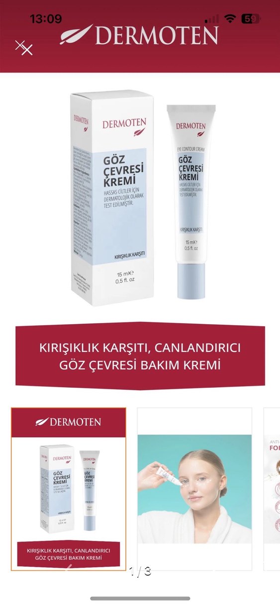 Dermoten göz çevresi kremi, kırışıklık karşıtı ve canlandırıcıdır. Hassas ciltler için dermatolojik olarak test edilmiştir. 15 ml.