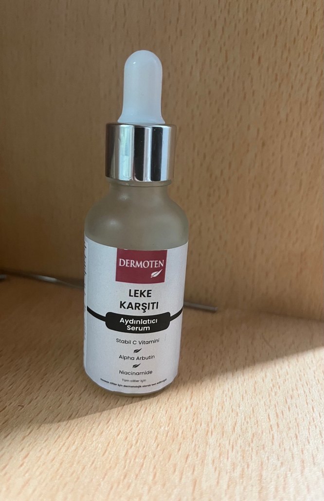 Dermoten Leke Karşıtı Aydınlatıcı Serum, stabil C vitamini, alfa arbutin ve niasinamid içerir. Lekeleri azaltır ve cilt tonunu aydınlatır.