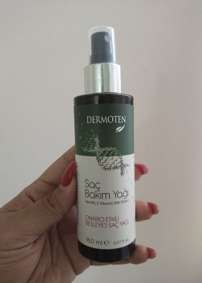 DERMOTEN saç bakım yağı doğal yağlar,keratin ve E vitamini içeren güçlü formülü sayesinde saçları beslenmeye ve onarmaya yardımcı olur.