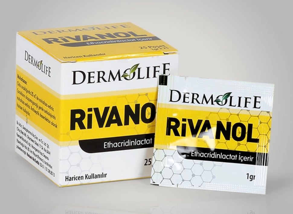 Dermslife Rivano antibakteriyel toz, Ethacridinlactat içerir ve 25 paket halinde sunulur.