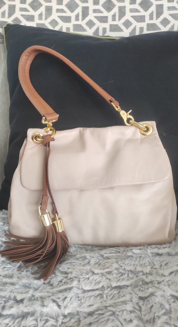 Bej renkte, deri malzemeden yapılmış, püskül detaylı tek saplı kadın çantası. Pastel tonu ve yalın tasarımıyla günlük kullanım için uygundur.