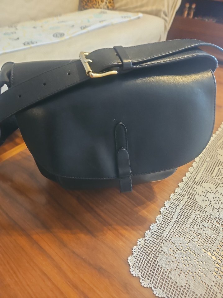 Siyah deri tokalı kayışa sahip, desen içermeyen, klasik biker tarzında kadın çantası..sapın kenarında hafif sürtünmeden dolayı belirsiz bir yıpranma var..