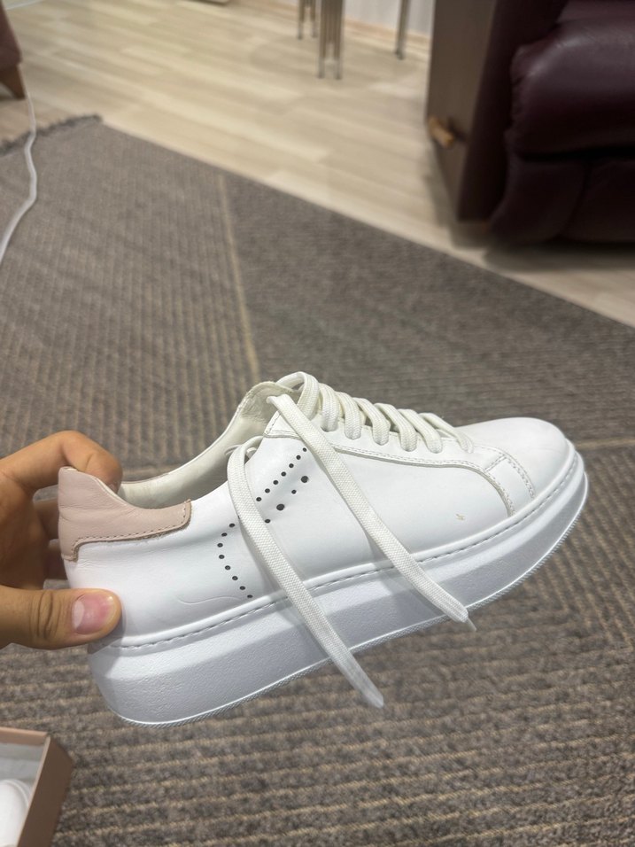 Platform topuklu, bağcıklı beyaz kadın spor ayakkabısı. Temiz kullanılmıştır sıfıra yakın