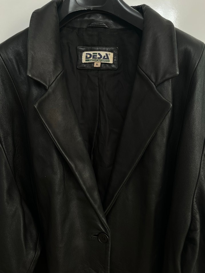 Siyah deri kadın ceket, notç yaka ve düğmeli tasarıma sahiptir. Uzun kollu, normal kesim ve midi boydadır, ofis ve sokak stiline uygundur. Oversize vintage bir modeldir benim proporsiyonuma uymadıgı için satışa çıkarıyorum bir sorunuz olursa lütfen yazın