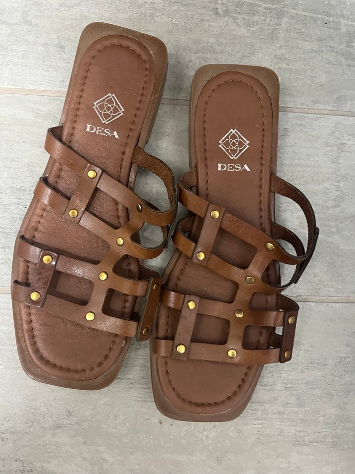 Kahverengi, detaylı sandalet. Yaz aylarında rahatlıkla kullanabileceğiniz şık bir model.