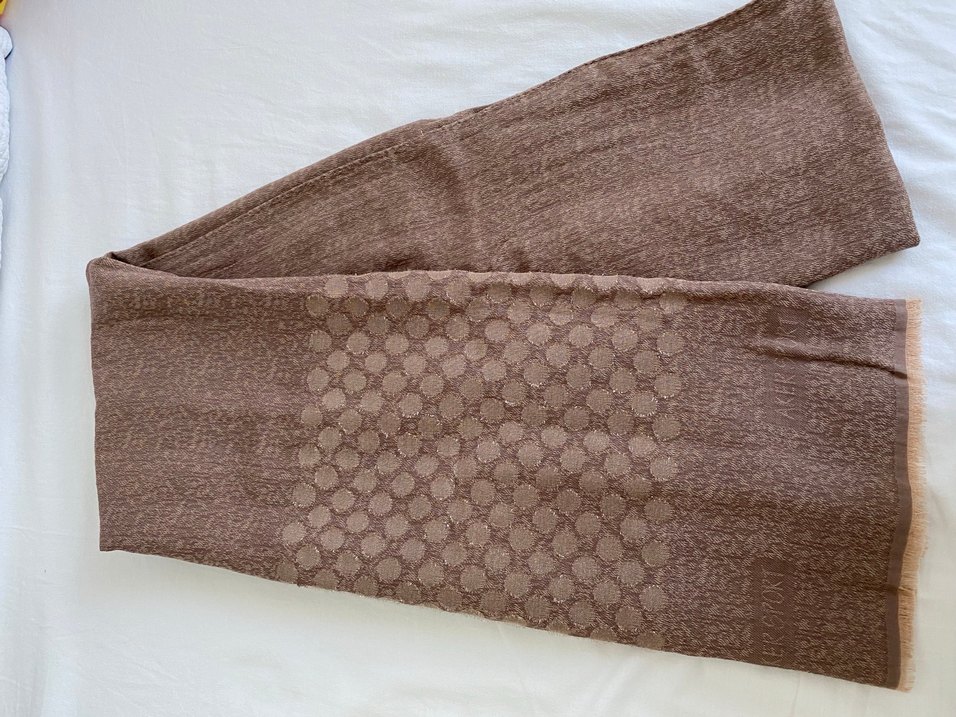 Desenli , parlak kahverengi sentetik kumaştan yapılmış kadın şalı, bohem ve retro tarzlar için sıcak ve rahat bir seçenek sunar.