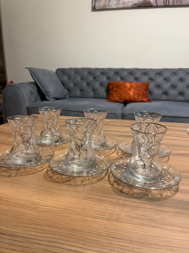 Bej ve gri desenli, ince camdan yapılmış 6'lı çay bardağı ve tabak takımı. Çay sunumu için şık bir seçenek.