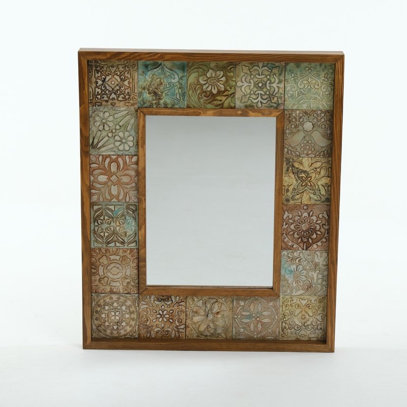 Desenli karo desenli, açık kahverengi ve yeşil tonlarında ahşap çerçeveli kare ayna. 55.65