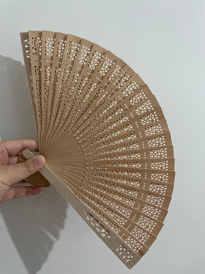 Hafif bej renginde, dantel desenli kesimlere sahip ahşap yelpaze. Tutması ve kullanması kolaydır. Ürün hiç kullanılmamış ve yenidir.