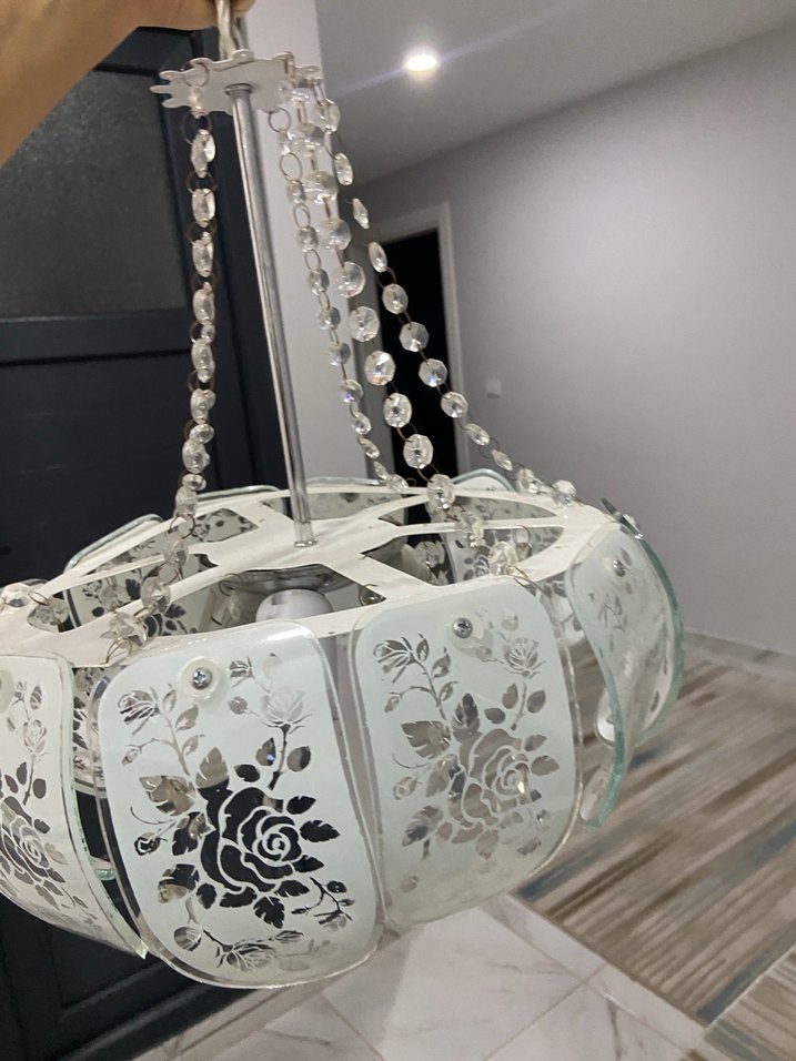 Çiçek desenli beyaz avize, boncuklu zincir detaylarıyla zarif ve şık bir aydınlatma sağlar. ürünler temizdir toplu fiyattır