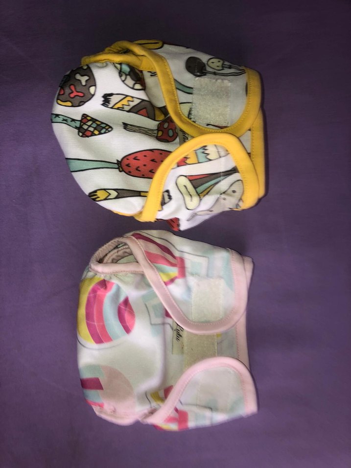 Yumuşak kumaş ve cırt cırt kapanışlı, renkli desenli 2 adet bebek bezi. Biri dondurma ve kemik desenli, sarı kenarlı; diğeri gökkuşağı ve kalp desenli, pembe kenarlı. yeni dogan dis bez temiz kullanılabilir