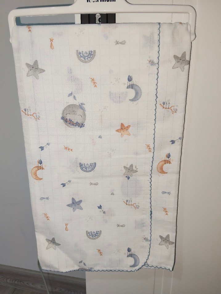 Yumuşak tekstil kumaştan, baskılı yıldız, ay ve yaprak desenli hafif beyaz bebek müslin örtü %100pamuk