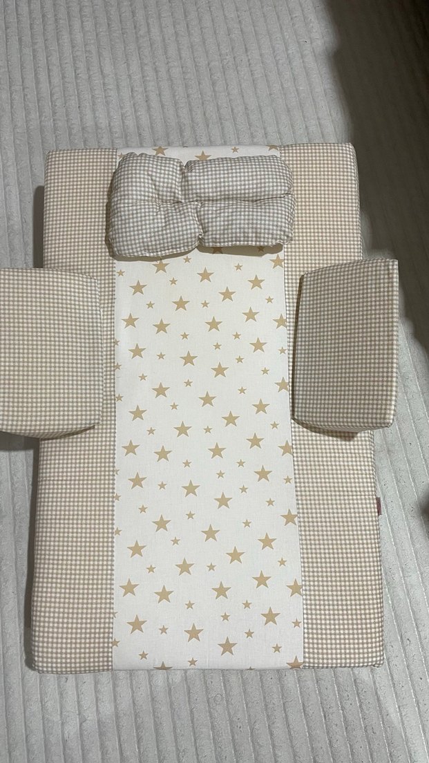 Yumuşak sentetik kumaştan yapılmış, ekose ve yıldız desenli bebek reflü yatagı seti. Konfor için yastıklar içerir. ⭐Ürün hiç kullanılmadı etiketi yok sadece.✨