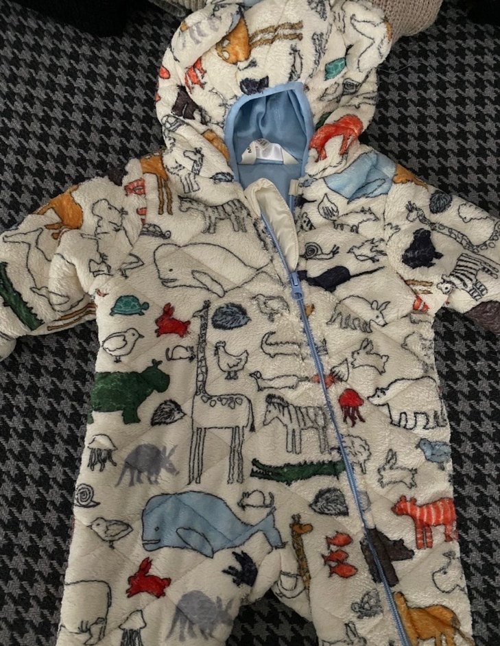 hayvan desenli ve kürk detaylı kapüşonlu bebek tulumu. Yumuşak ve sıcak kumaştan üretilmiştir. 6-9 ayak uygundur