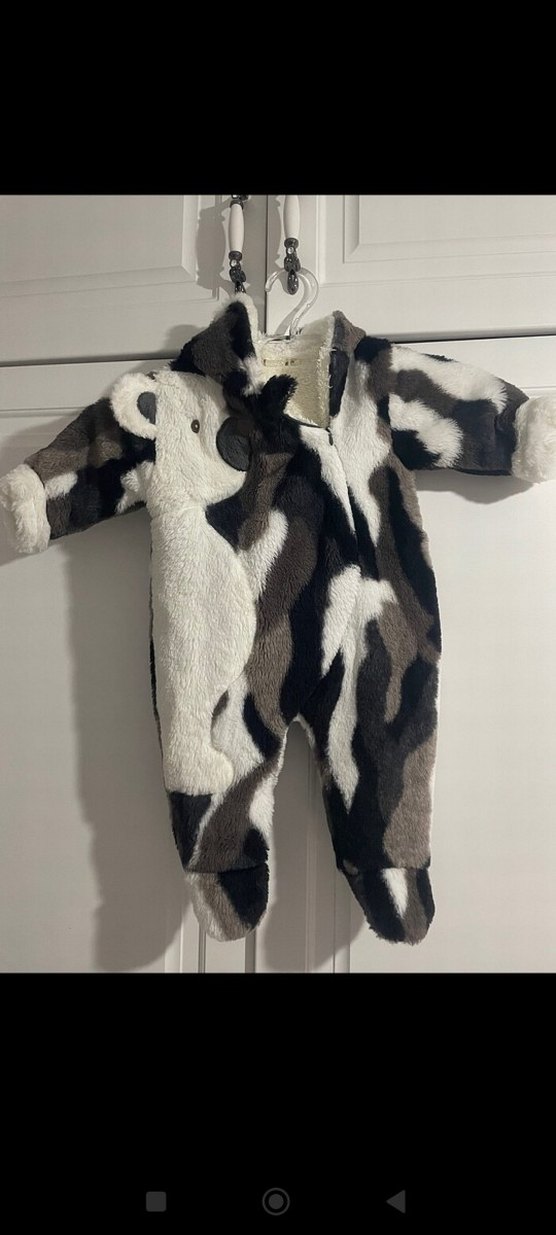 Desenli, kürklü detaylara sahip, yumuşak ve sıcak kumaştan yapılmış bebek tulumu. Sokak tarzında, soğuk havalar için uygundur. 3- 6 ay.