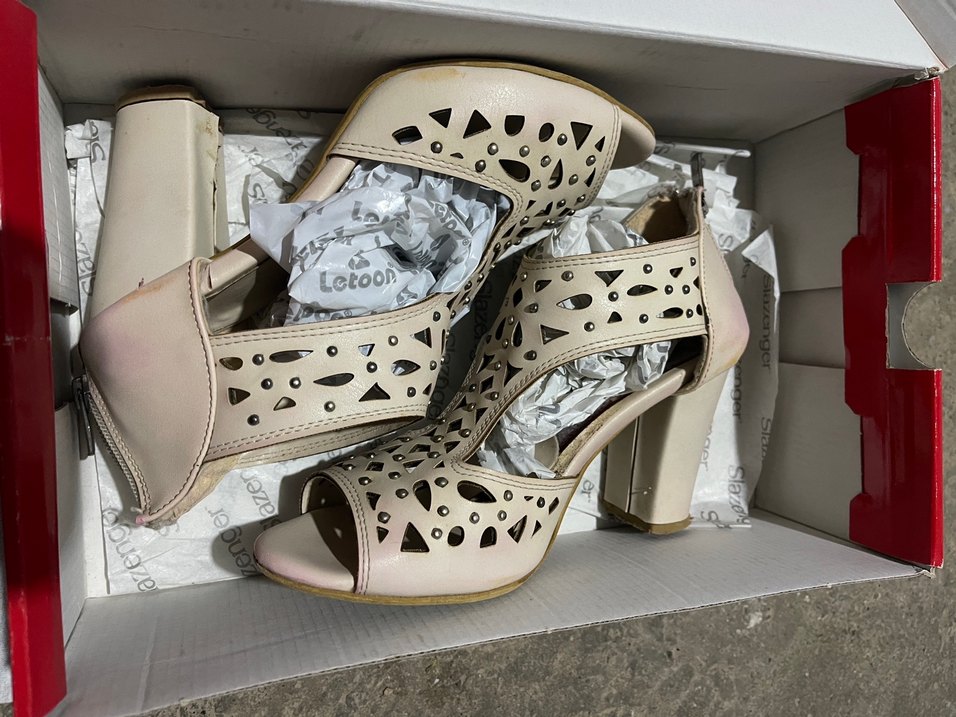 Bej renkte, baskılı kesim detaylı ve dantelli, kauçuk malzemeden blok topuklu kadın sandalet. Düğünler için uygun çağdaş tasarım.