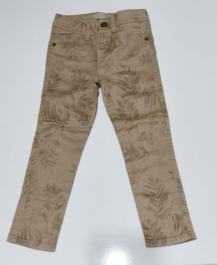 Düğmeli, desenli bej kız çocuk pantolonu. Rahat kesimli ve sentetik kumaştan, sokak tarzına uygun.
