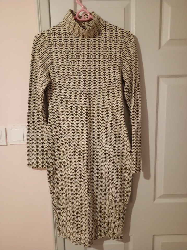 uzun ve dar kesim triko elbise. Yüksek yakalı ve bej-gri renklerde, sentetik kumaştan üretilmiştir. Bohem ve şık tarz için uygundur. az kullanıldı sorunsuz ihtiyaç fazlası yeni gibi