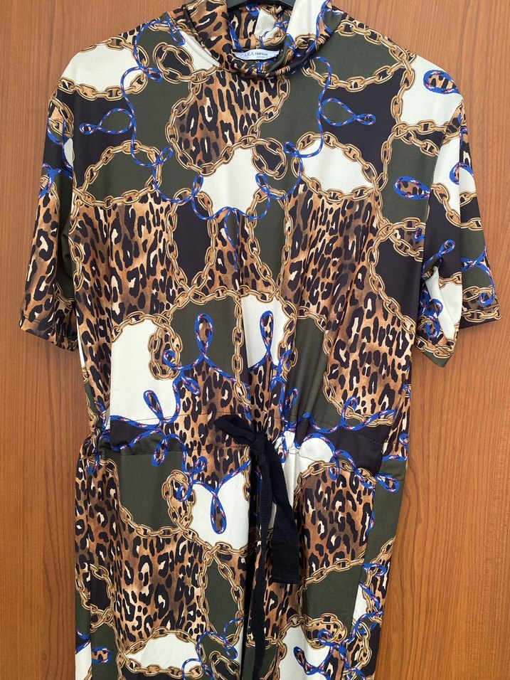 Desenli. Belden büzgülü kısa kol elbise