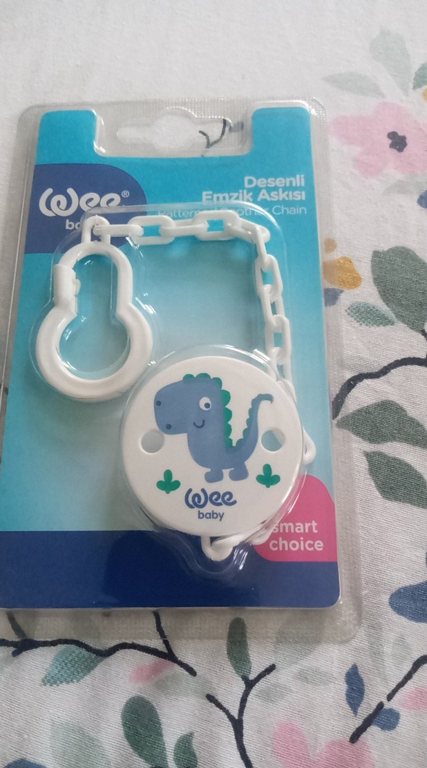Renkli dinozor desenli beyaz emzik askısı, güvenli klips ve hafif plastik zincir halkalarından oluşur. Bebekler için uygundur.