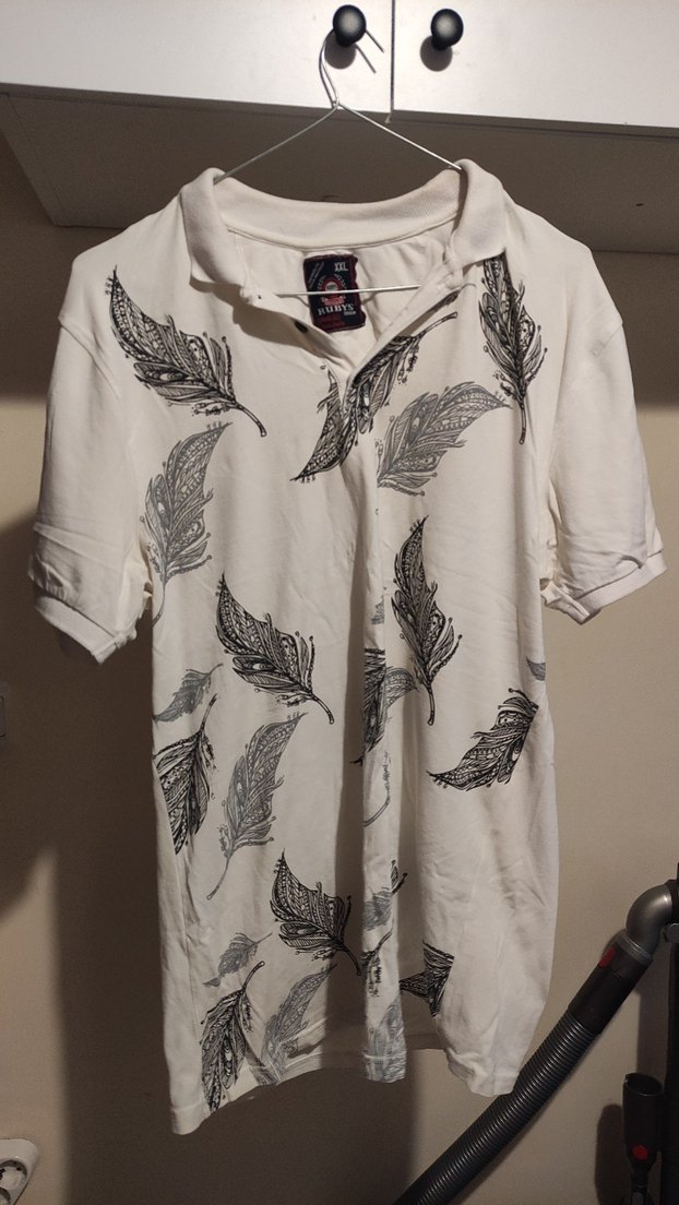 Beyaz renkli, bol kesim erkek polo tişört, kısa kollu ve yakalıdır. Üzerinde siyah tüy desenleri ve düğmeli ön detay bulunur. tam pamuk kumaştan üretilmiştir. marka temsilidir.
