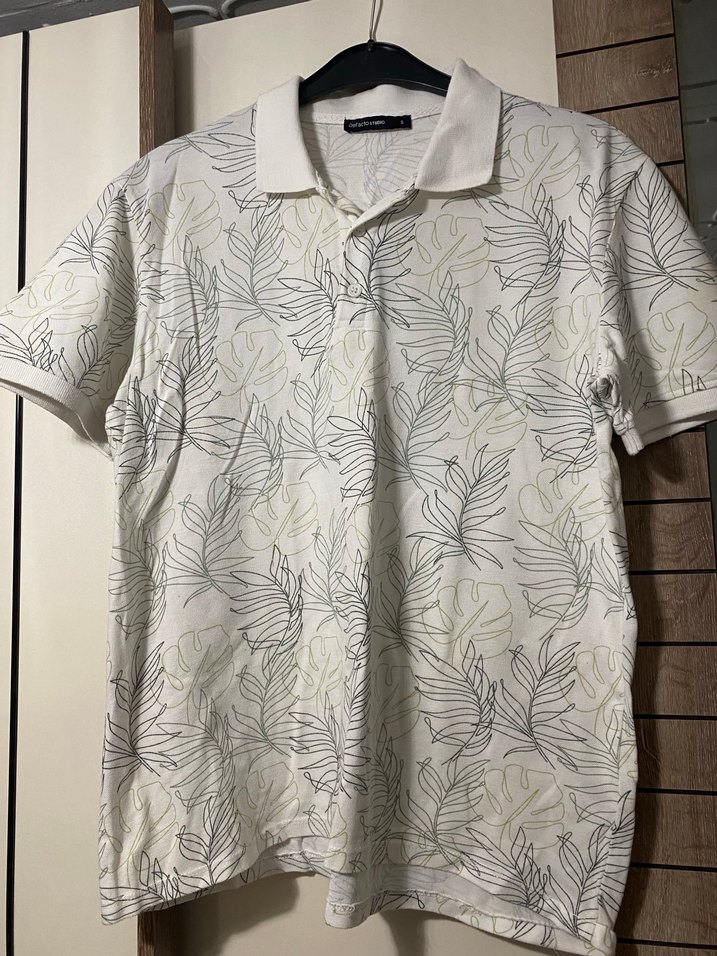 Erkekler için beyaz tabanlı, gri yaprak desenli, düğmeli, kısa kollu, yakalı ve bol kesim polo tişört. Sentetik kumaştan, günlük rahat stil için uygun.