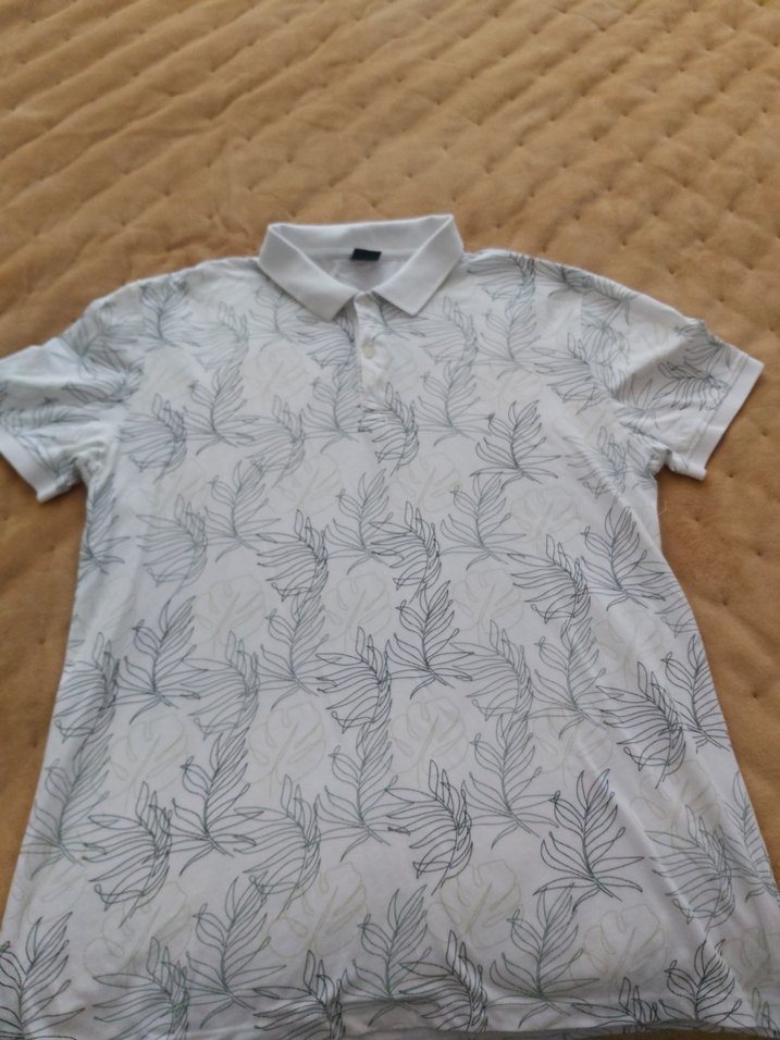 Düğmeli yakalı, yaprak desenli beyaz erkek polo tişört. Kısa kollu, rahat kesimli ve sokak tarzına uygun.olculer resimde