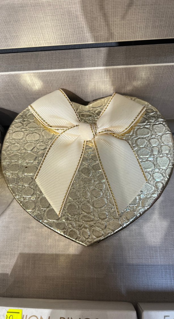 Kadınlar için desenli, parlak beyaz fiyonk detaylı kalpli hediye kutusu. Klasik ve modern.