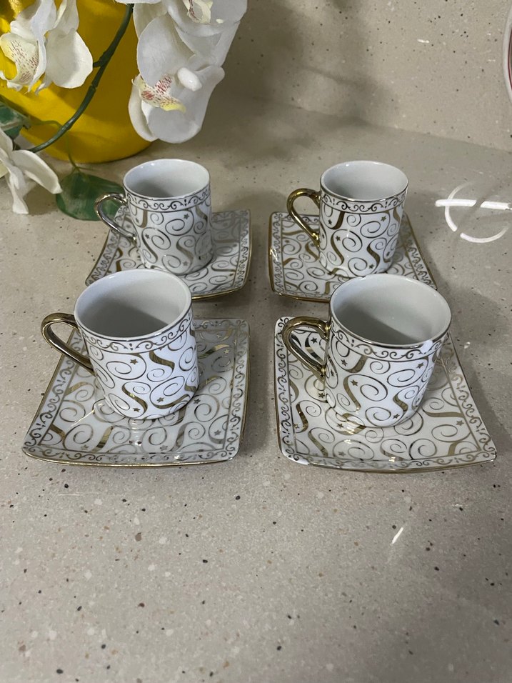 Yaldız gold desenli beyaz kahve fincanları ve kare tabaklardan oluşan set, altın renkli kulplara sahiptir. ☕4 adettir bır tanesınde ufak bır hasar var kullanıma engel degıl #fincan