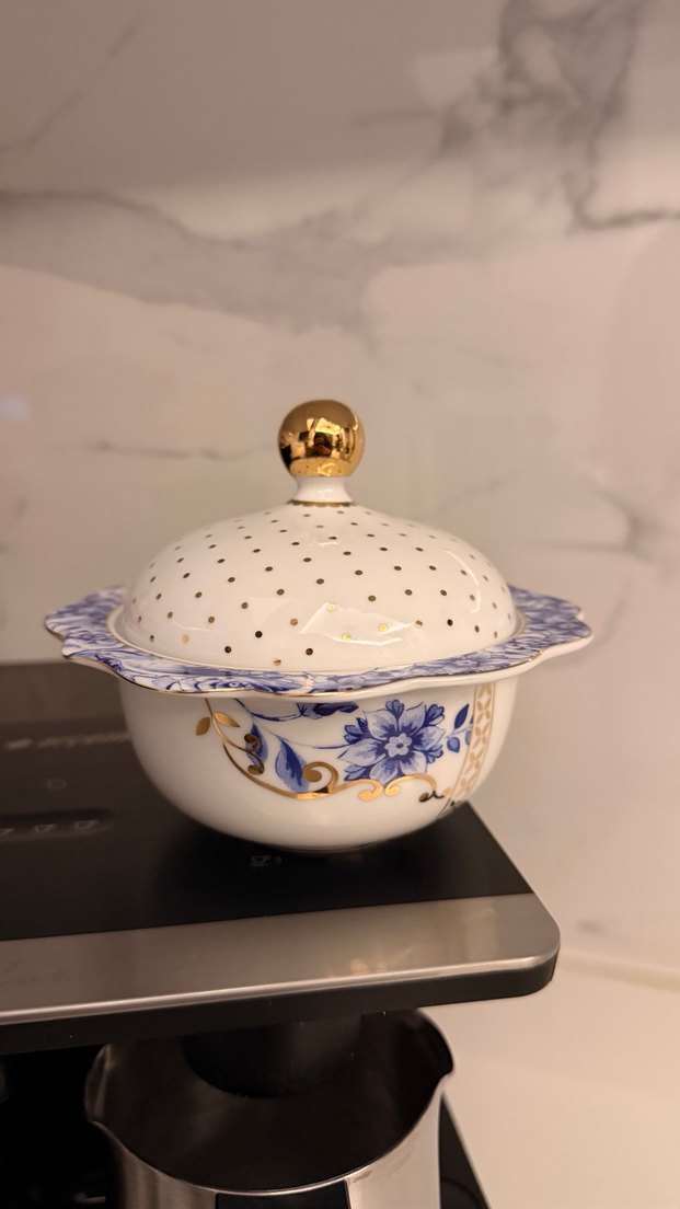 Mavi çiçek ve altın detaylı desenli beyaz servis kasesi. Delikli kapak ve altın renkli kulp bulunur. ️