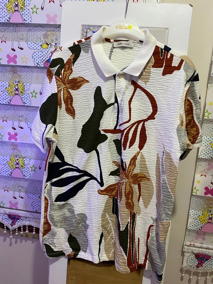 Sentetik kumaştan, desenli ve düğmeli yakalı, bol kesim beyaz kısa kollu polo tişört. Rahat ve gündelik kullanım için uygundur.