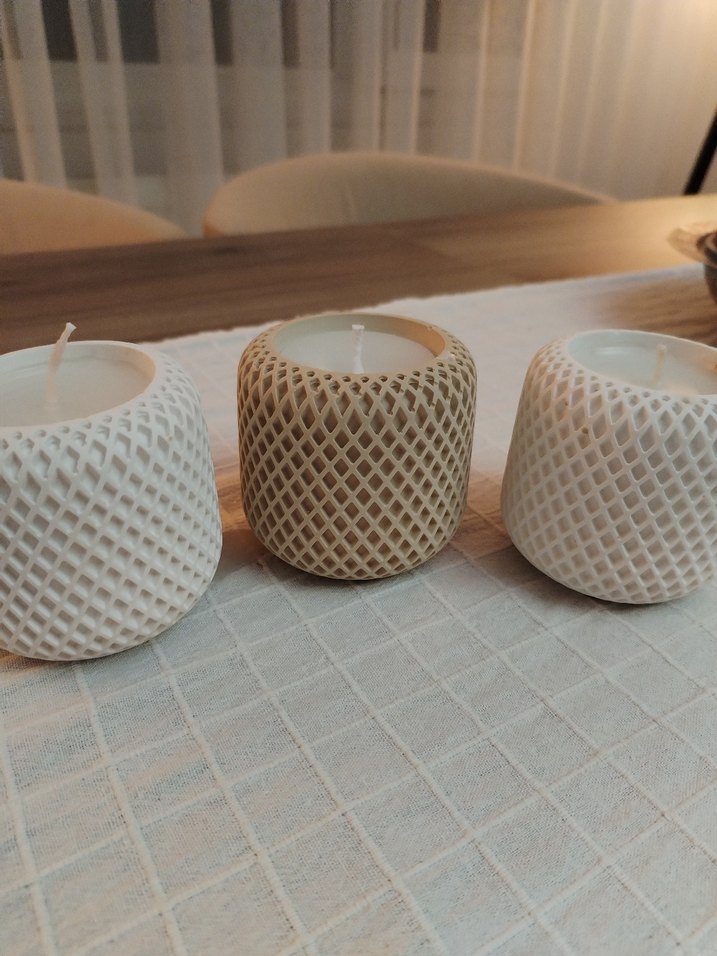 Dantel desenli, beyaz mumluklardan oluşan üçlü set, mekana zarif bir dokunuş sağlar.