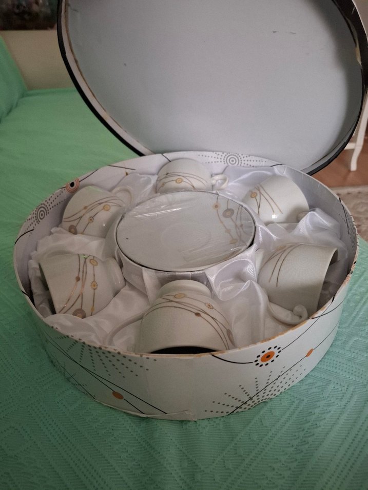 Desenli beyaz porselen fincanlar, yuvarlak dekoratif kutuda sunulmuştur. İçecek servisi için uygundur. ☕
