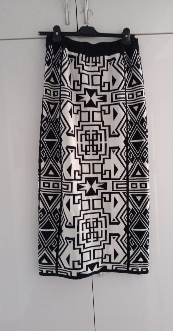 Desenli siyah beyaz geometrik desenli, kemerli, uzun ve dar kesim bohem tarzda ve açık hava kullanımı için uygundur.