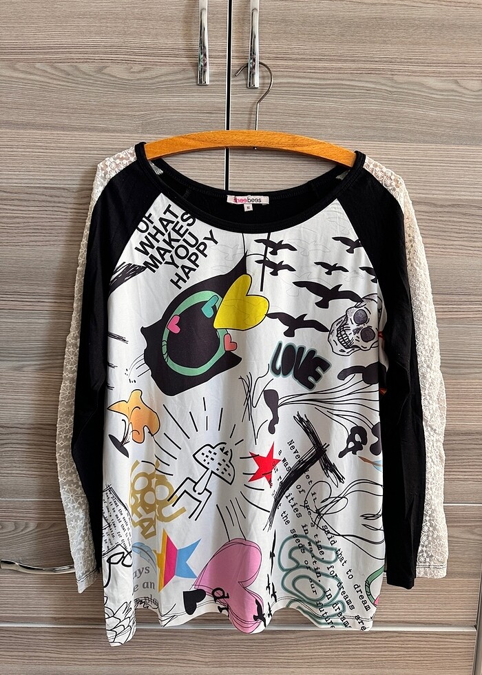Ürün çok orijinal bir parçadır. Kolları dantel detaylıdır. Önü desenli arkası düzdür. Medium-Large beden uyumludur.