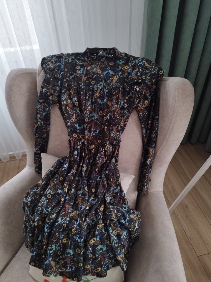 yüksek yakalı ve drapeli tasarımıyla koyu desenli kumaştan. Bohem tarzı ve kol detayıyla günlük kullanıma uygun kışlık elbise süet kumaşı ile bir adım önde sadece bir defa kullandı herhangi bir defosu yoktur