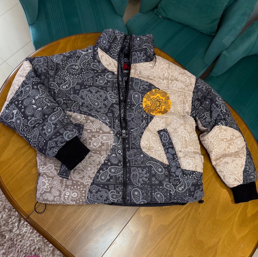 Yüksek yakalı ve fermuarlı önü olan, bol kesim desenli gri-bej ceket. Sokak tarzında, yumuşak ve sıcak kumaştan, uzun kollu ve midi boyda, günlük kullanıma uygun.
