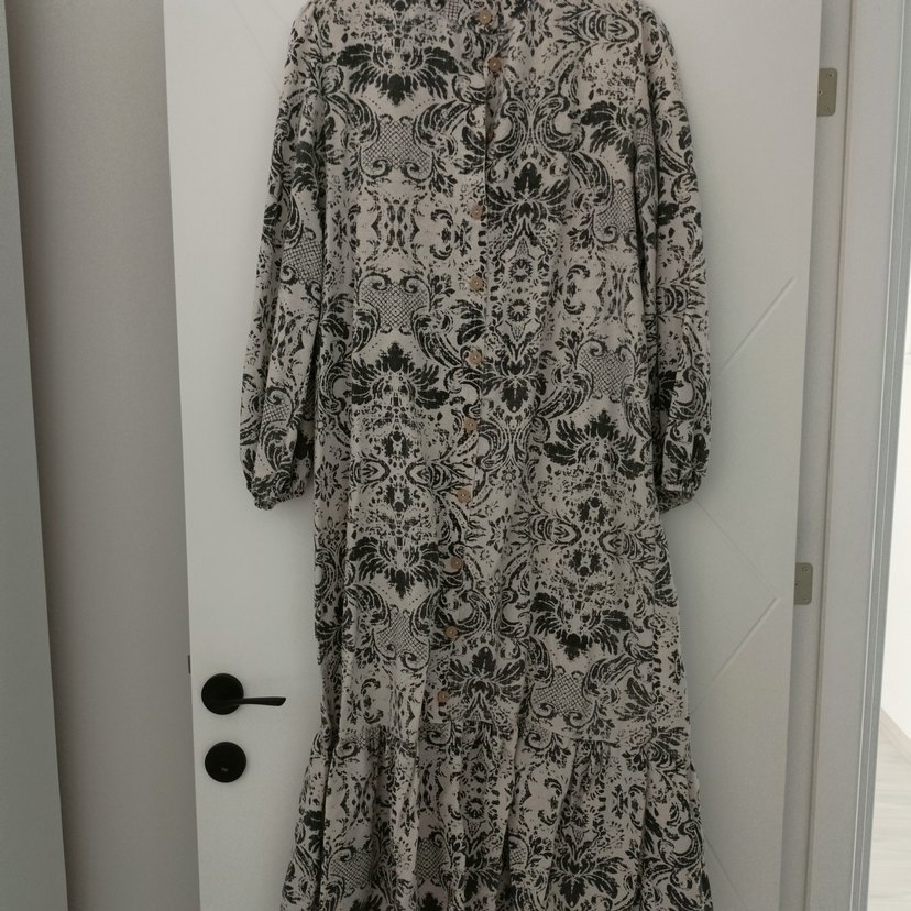 Yüksek yakalı, düğmeli, bol kesim ve uzun kollu bu elbise, yumuşak sentetik kumaştan yapılmış gri bohem desenlidir.