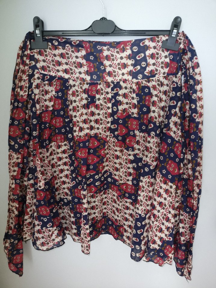 Desenli, bol kesim hamile midi etek, koyu tonlu çok renkli kumaş ve fırfır detaylarıyla günlük kullanıma uygun bohem tarz sunar.