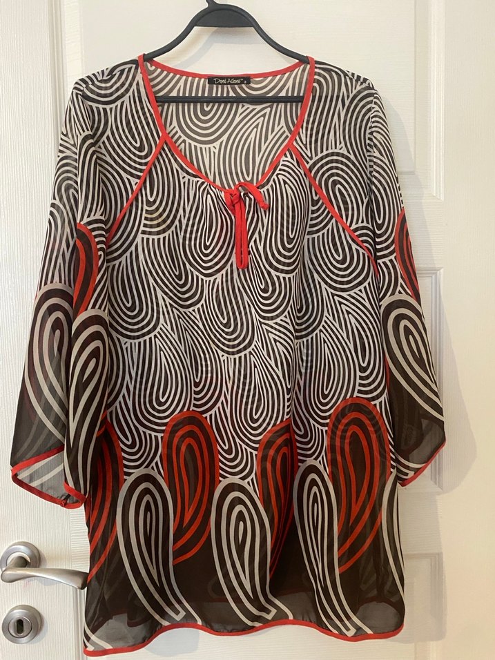 Bohem tarzda, V yaka ve uzun kollu, desenli ve drapeli hamile tunik. Normal boyda ve rahat kesim, günlük kullanıma uygundur.
