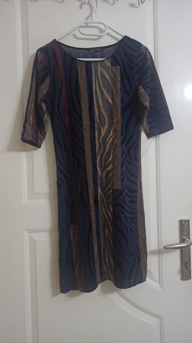 Kısa kollu,kadife, tekne yakalı, desenli ve bohem tarzda. Tunik veya elbise olarak kullanılabilir. Ofis kullanımı için uygun. Boyu 90 cm, göğüs 46 cm, bel 42 cm. xs beden yazıyor ama s yani 36 bedenede olur.